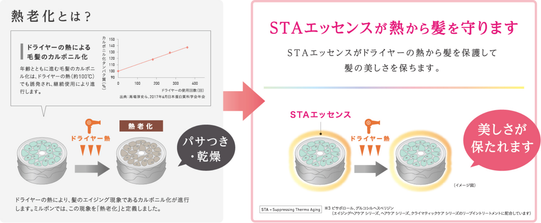 年齢とともに髪の「カルボニル化」が進むと、髪にパサつきや乾燥が起こります。ミルボンでは世界で初めて、洗髪後のドライヤ ー習慣のような、熱という外的要因によってもカルボニル化が進むことを発見。熱から髪を守る毛髪保護成分「STAエッセンス」をリーブイントリートメントに配合しました。